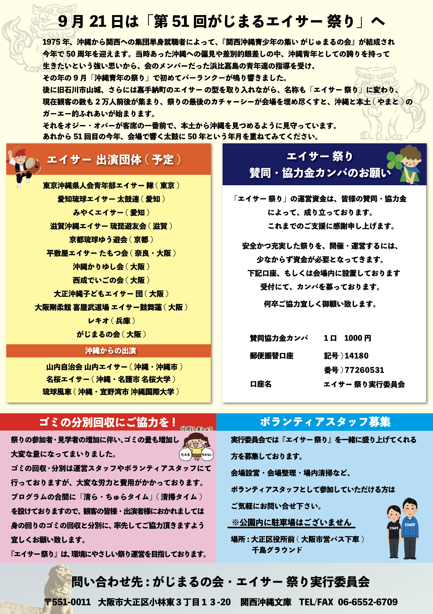 今年はその50周年記念の意義を踏まえ、殺伐とした現在社会において、私たち「がじまるの会」が開催する本エイサー祭りが本土と沖縄のチムグスイとなればと思います。